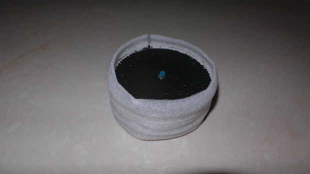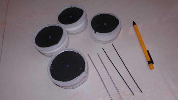 Hacer ruedas con espuma de alta densidad. Cortar discos circulares de tamaño 4inches de diámetro y añadir un tubo de plástico a cada rueda.