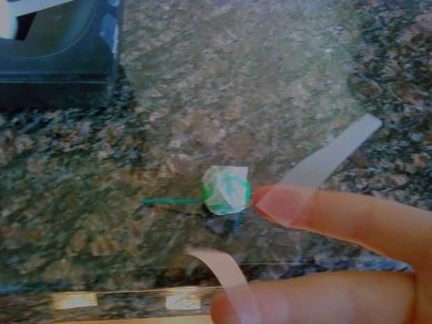 Tomar un trozo de cinta y lo rip (o cortar) en la mitad, luego ponerlos a ambos lados del fusible en un ligero ángulo, como se muestra. Ahora, estás acabado! Debería verse como la foto 2 º cuando termine.