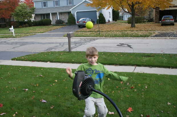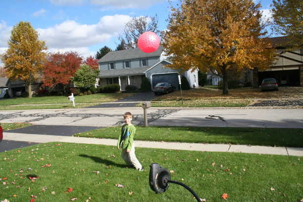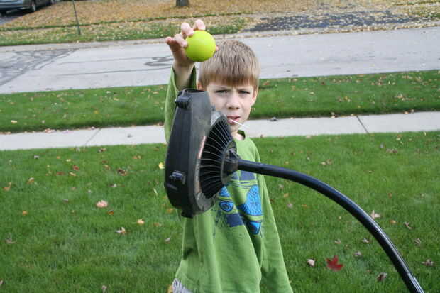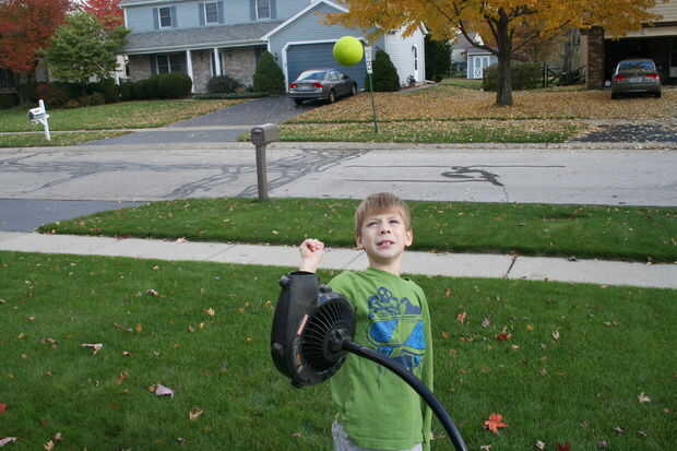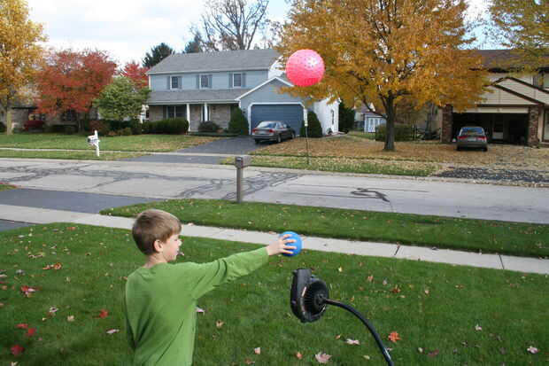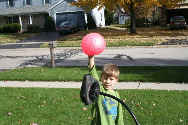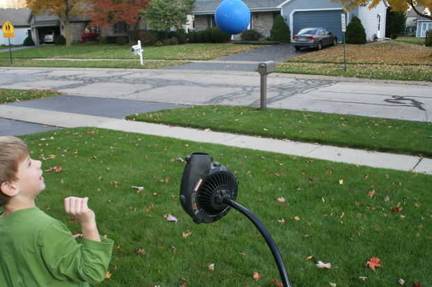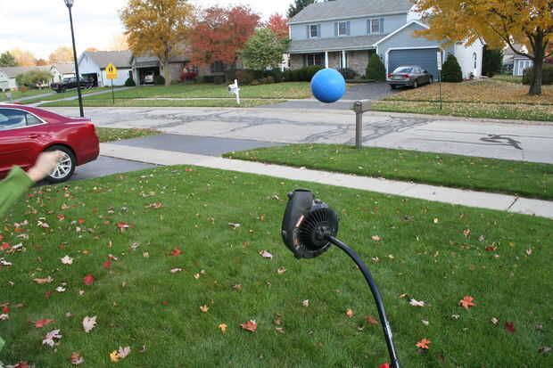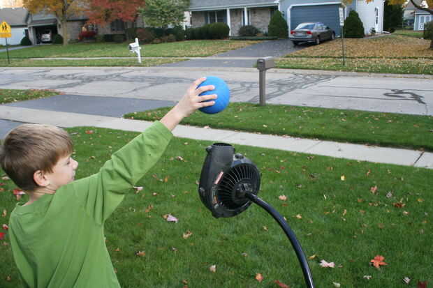 Con cuidado poner la bola en la corriente de aire. Observar la pelota flotando en la corriente de aire. Suavemente mueva el ventilador de un lado a otro. El balón se parece flotar con "nada" debajo de él.