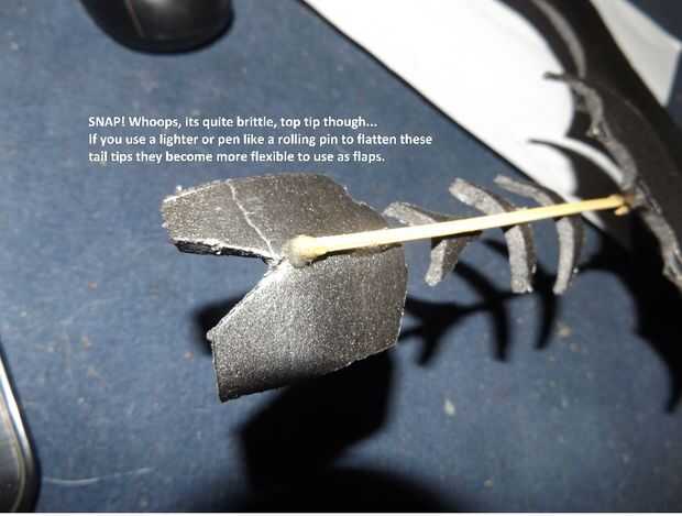 Sugerencia - las aletas de la cola son el punto más eficaz para cortar el vuelo de tu dragón. El poliestireno es muy frágil, para evitar esto que tenemos que aplastar el poliestireno plano donde vamos a doblar, la mejor manera de hacerlo es utilizar la punta redondeada de un mango de destornillador - sólo rodar firmemente sobre las aletas. Esto es más fácil antes de pegar!