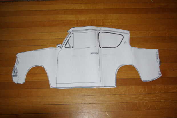 Lo primero que tenía que hacer era encontrar la imagen de la derecha para hacer una plantilla. después de buscar en google imágenes por horas decidí en la imagen utilice y sea necesario modificarlo en adobe. La ubicación que estábamos planeando utilizar no sería capaz de sostener un modelo a escala del coche así que él, un poco cartoonish había aplastado pero funcionó.