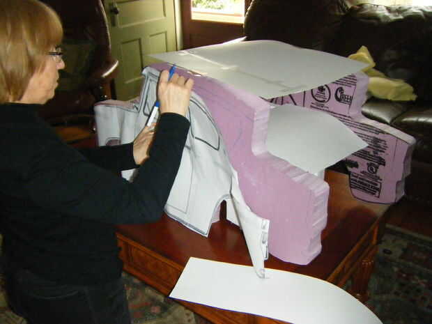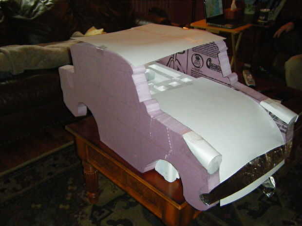 Una vez que el cuerpo fue descubierto más o menos la plantilla entonces fue utilizada para agregar los detalles de puertas y ventanas. las líneas de las ventanas y puertas eran trazadas sobre y ligeramente excavadas en la espuma con un lápiz. Información adicional de faros, luces traseras y la parrilla tenía plantillas creadas para ellos. la parrilla se corta de una rejilla de malla de alambre que habíamos dejado de la instalación de un dren francés en la yarda. la luz se hicieron de la misma cartulina plástico como techo. los emblemas y divisas fueron tomadas de fotos de los coches reales y recortadas para que ser impreso en alta calidad, corte y laminados.