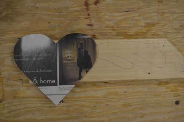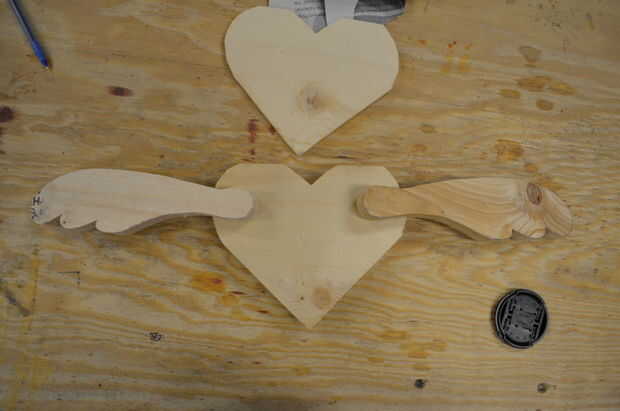 Una vez que tienes plantillas de papel cortadas, trazarlos a su madera: dos alas, tres corazones.