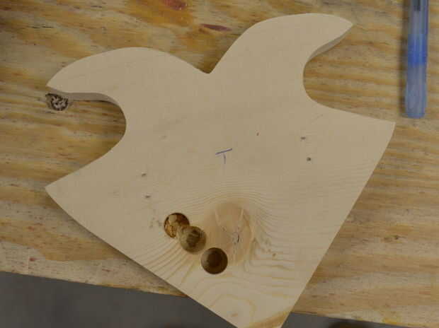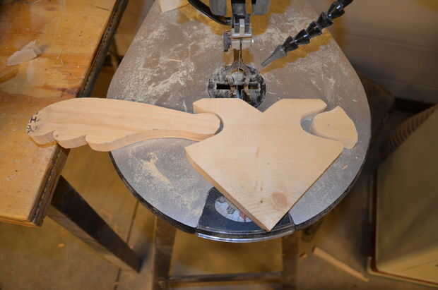 En este punto tenemos que considerar el peso del corazón vs el peso de las alas. Si imaginamos la mitad izquierda del corazón y su asociado ala como un objeto diferente que la mitad derecha del corazón y su asociado ala, queremos que el centro de gravedad de cada uno de los dos objetos a ser algo fuera del corazón. Tampoco podemos hacer realmente pesadas alas pegando unos centavos a sus espaldas, o nos podemos ahuecar en el centro del corazón. He votado vaciamiento, así que en este punto he perforado unos agujeros aunque la base y cortar una porción significativa de su centro con un jig de la sierra. En realidad lo hizo más en mi build, pero deseaba que había hecho en este punto ya que las grapas utilizadas en el siguiente paso en el camino de hacer cortes una vez que están asomando de la madera.