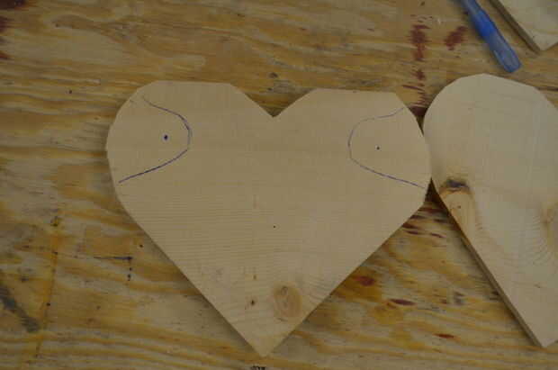 Las plantillas de papel, marque el punto de pivote en el ala y a ambos lados del corazón, entonces transferir estos puntos a las alas de madera y todas las formas de tres de corazón. Siempre utilice la línea de centro de tu corazón para orientar la plantilla.