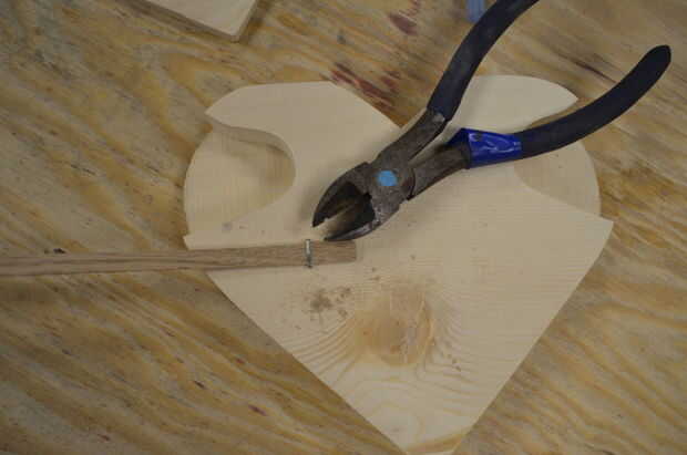 Prefiero a apilarlos todos una lijadora de banda alrededor del borde, pero necesitamos las piezas para mantener estable mientras trabajamos. Obtener una pistola de grapas y una delgada franja de desecho casi plana de madera para utilizar como separador. Coloque la chatarra encima de la base y un elemento básico del fuego que se extiende a la chatarra. Deslice el desecho hacia fuera de debajo de la grapa, dejando un bucle que sale del núcleo, similar a una puerta de croquet. Dos grapas de la grapa en el corazón de esta manera, uno a cada lado. Entonces, con tijeras para alambre, cortar de la barra superior de cada grapa. Esto dejará cuatro puntas pequeñas que sale la pieza de corazón del núcleo. Suavemente Coloque uno de vuestros corazones cubierta encima de la base, alinear de mejor forma posible (alineando el centro es lo más importante) y luego empújela hacia abajo firmemente para que los dientes asomando de la base se coloque en la cubierta. Esto hará que las piezas resisten presiones laterales, pero todavía le permiten retirar fácilmente la cubierta. Repita este proceso en el otro lado de la base para la segunda pieza de la cubierta.