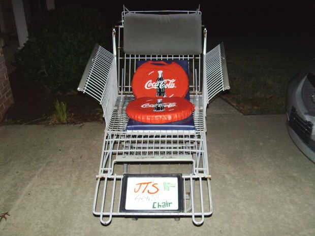 esto dice cómo reparado un camping estilo redneck de silla.  Todo lo que se necesitaba era una silla, cinta, trozos de madera, una correa de bandolera, una aguja, hilo, jabón... y cierta ingenuidad antigua.Imágenes:1 - detrás de la silla, tenga en cu