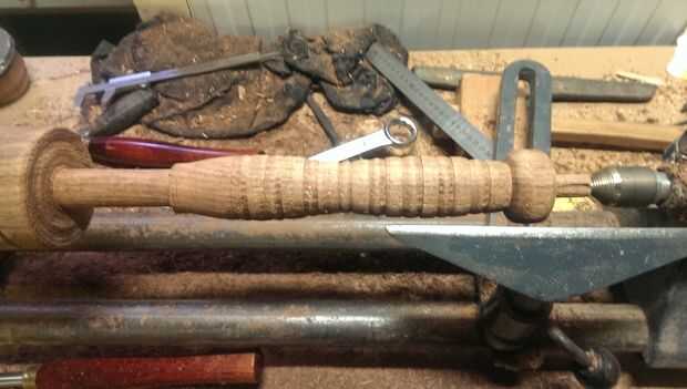 Para la manija que necesitaba tener una espiga para caber a través de la cabeza del macillo, así que usando mi nonios seguí escopleo con gubia una longitud de 70mm hasta que era un uniforme de 25mm de diámetro. Luego caminó el inicio de la manija hacia fuera a 32mm y tomó mis cirios de allí. No tengo forma de sistema en mente, uno que se sentía cómodo, así que seguí formando y parando, formar y parando, hasta que yo estaba contento con la sensación de.