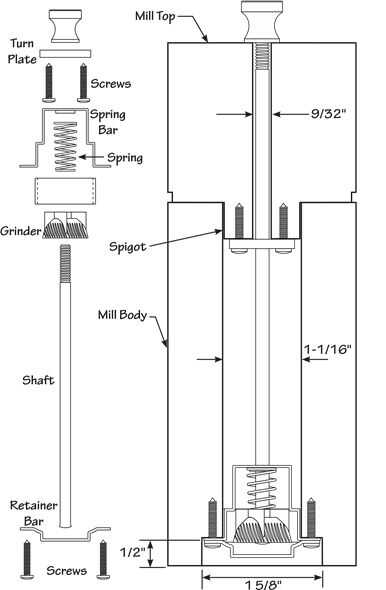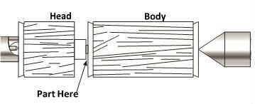 de lugares. En primer lugar, parte la primera ¼" en cualquiera de los extremos del espacio en blanco para crear espigas de sujeción de la chapa. En segundo lugar, crear una pieza que empieza en ~ 3 ¼" de la cabeza del elegido del molino en blanco. Esta parte tendrá que ser 1 1/16" de diámetro y ½" largo. Directamente por debajo de esta parte, crear una 1/8" ancho parte que se utilizará para separar la cabeza de la parte inferior. Cuidadosamente parte el espacio en blanco en este punto. Asegúrese de apoyar el espacio en blanco que separa la parte. Una manera de hacer que la parte es cortar casi todo el camino con el torno. Parar el torno y terminar el corte con una sierra pequeña.