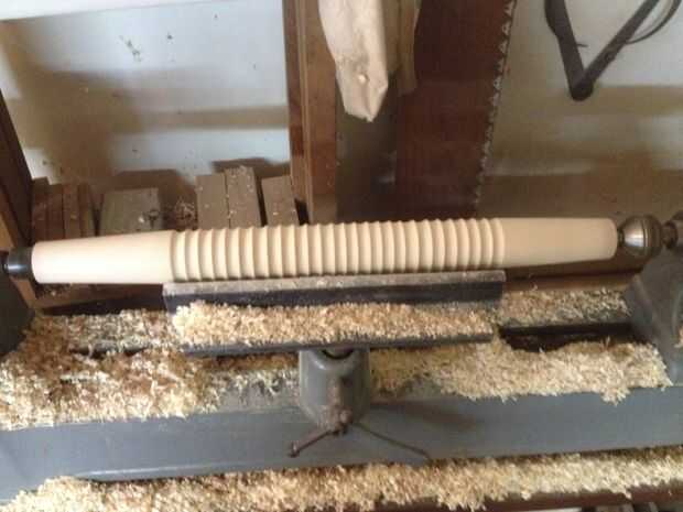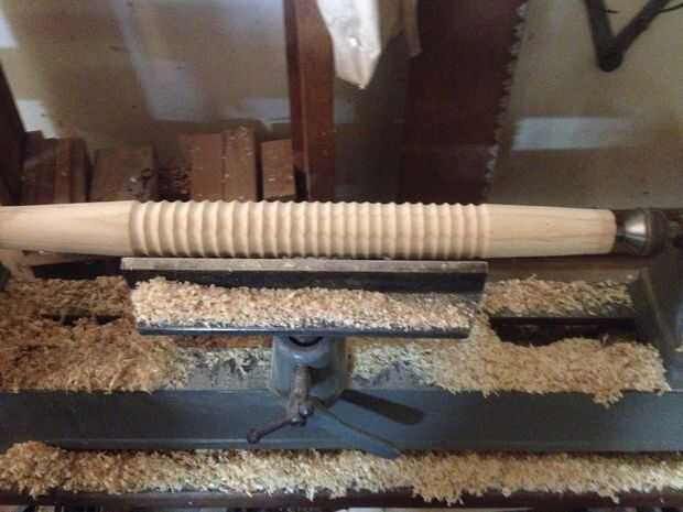 Con su gubia nuevo lentamente agregue ranuras consecutivas a lo largo de la superficie de centro plano del rodillo, convirtiéndose en un cortador de tallarines. Las manijas y las ranuras con una lija de arena, hice este uno hasta grano 400 y aplicar acabado de grado de alimentos si lo desea. No hice aplicar y terminar a la mía.