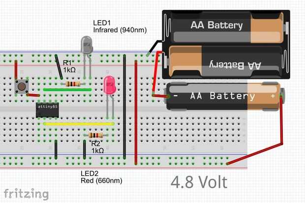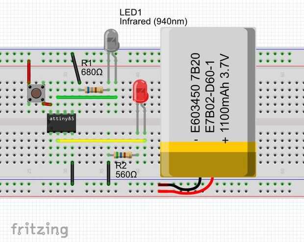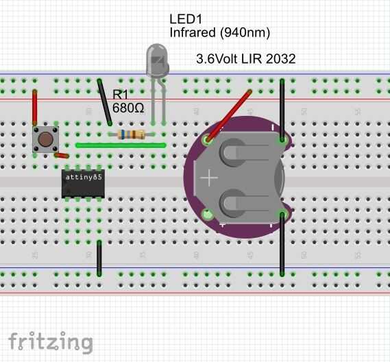 Tenga en cuenta, a 3,3 voltios, que la unidad no funciona. Y dos pilas de botón son demasiado altos para el ATtiny (máximo 5.5V)