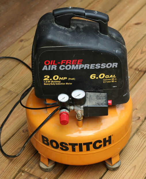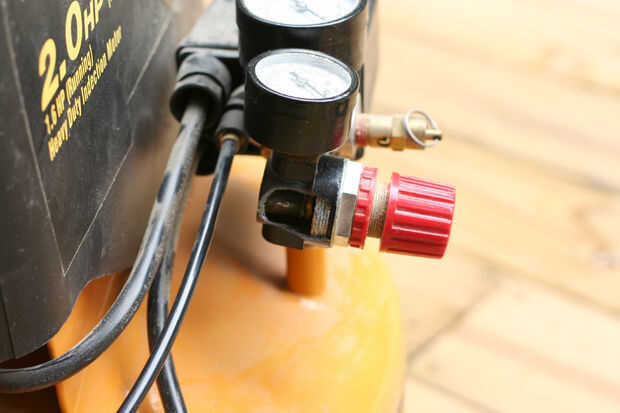 tomé prestado el compresor de mi padre para terminar algunos trabajos en mi terraza. Como se puede ver en la imagen, ha sido alrededor de la cuadra un par de veces. Después de fijar un día oí más aire que escapa generalmente. Resulta que el regular había roto justo donde conecta la manguera de aire. Cinta adhesiva de un anterior intento por detener una fuga de aire era todo lo que sostenía la manguera del compresor.