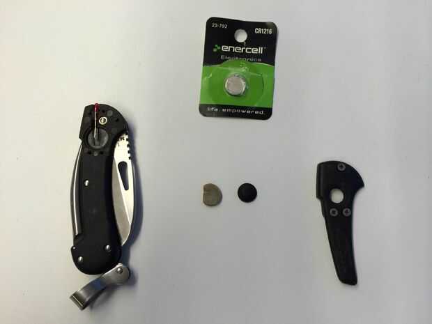 Esto expondrá el soporte de la batería, compresor de la espuma y botón de plástico. Para referencia la batería que utiliza para este cuchillo es un CR1216 (cuando compré el cuchillo que le faltaba la batería por lo que no estoy seguro si esto es correcto, pero ya que no pude encontrar la respuesta en cualquier lugar en las interwebs, decidí hacer este instructable para ayudar a la próxima persona que pregunta lo mismo)