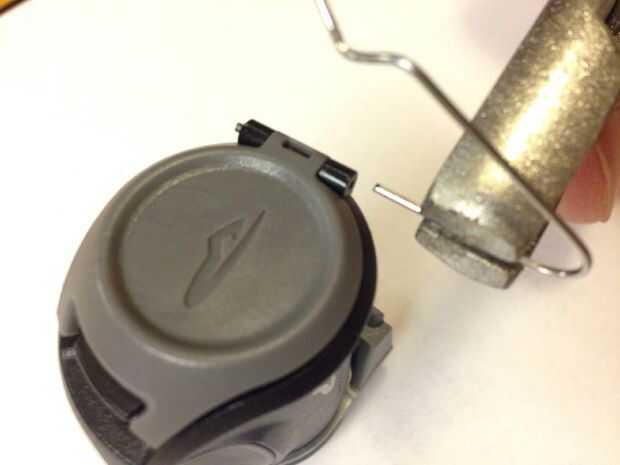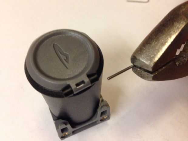 Utilizando un objeto pequeño (usé el extremo de un clip pequeño), suavemente empuje hacia afuera el pasador de la bisagra de la puerta rota viejo. Una vez más, tenga cuidado de no hacer uso excesivo de la fuerza que puede romper el perno monta en la carcasa del foco. Sujete el caso firmemente, para evitar que las mitades de tratar de separar mientras empuja el pasador hacia fuera.