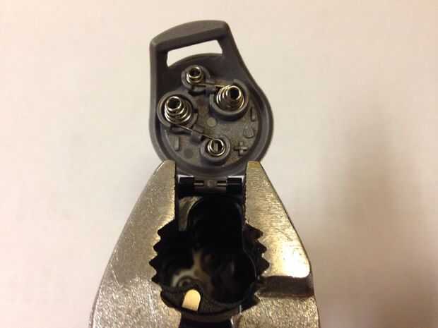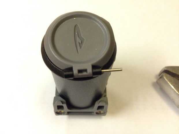 Utilizando pinzas, presione suavemente el flush de pasador de la bisagra en el montaje en la carcasa del foco.