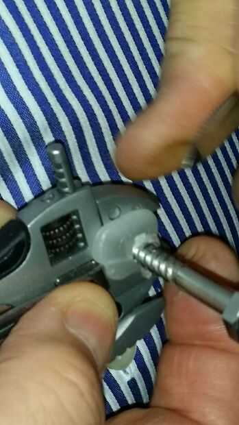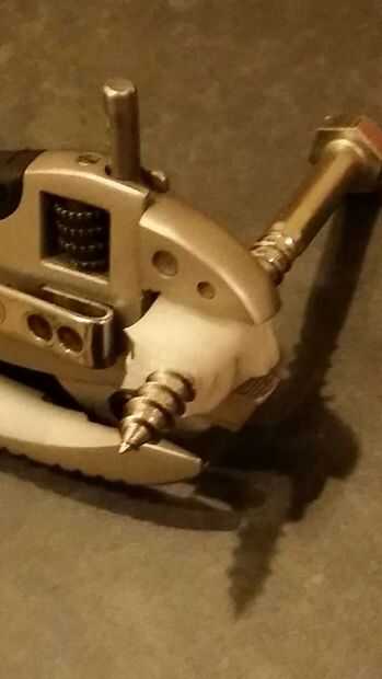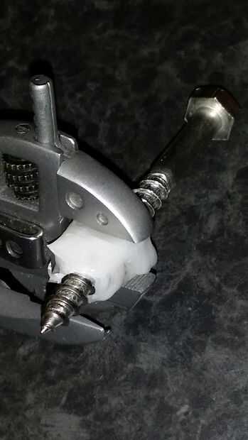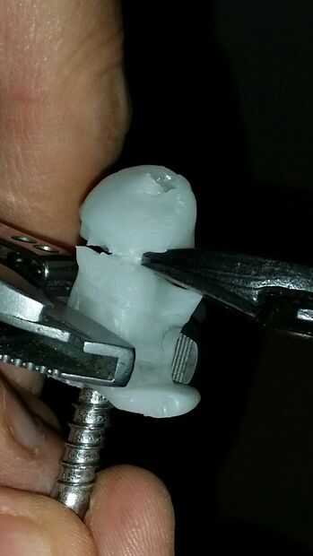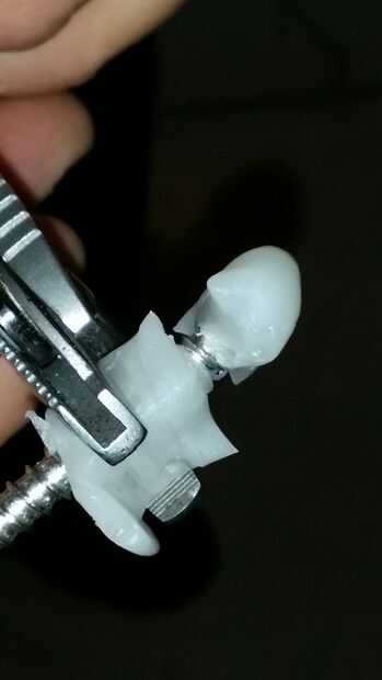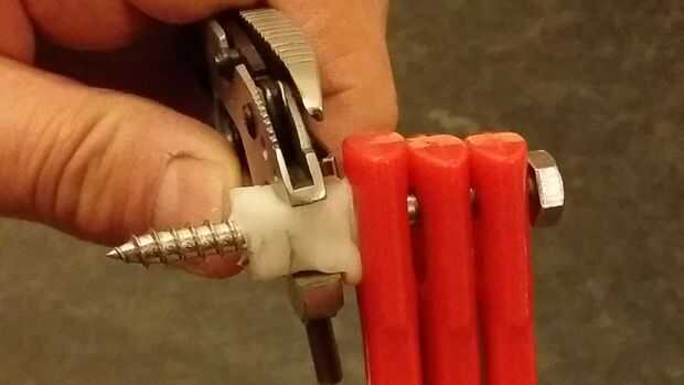 Otra vez, simplemente Envuelva el Instamorph alrededor de la parte roscada del perno coche y dejarlo establecido. También utilizamos una llave ajustable para añadir pisos a él, y luego cortamos el extremo con los cortadores. El resultado final era una tuerca resistente que permite hilo y sostener estos tres pedacitos de plástico.