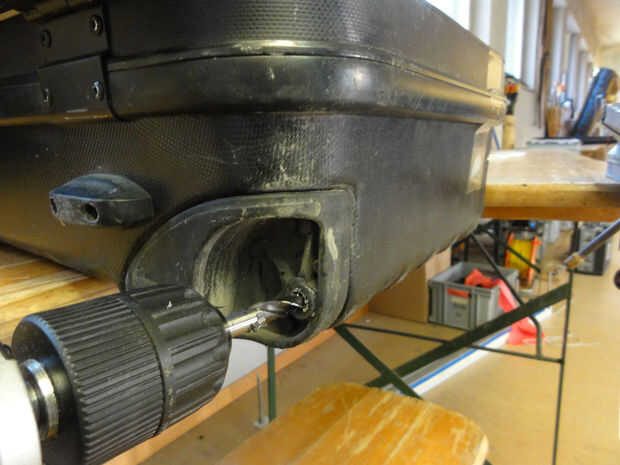 Con un taladro de 8mm, perfore un orificio en ambos lados de la bowcase donde los dos árboles eran en el pasado.