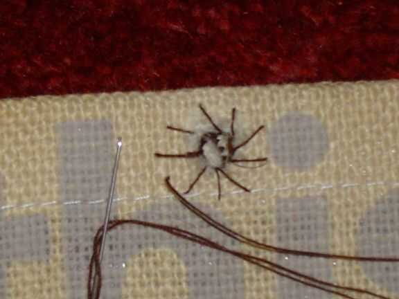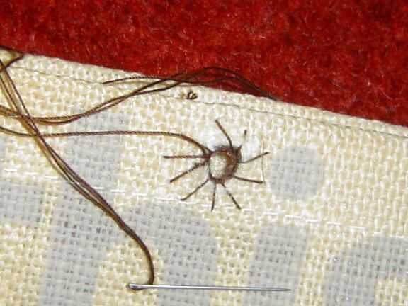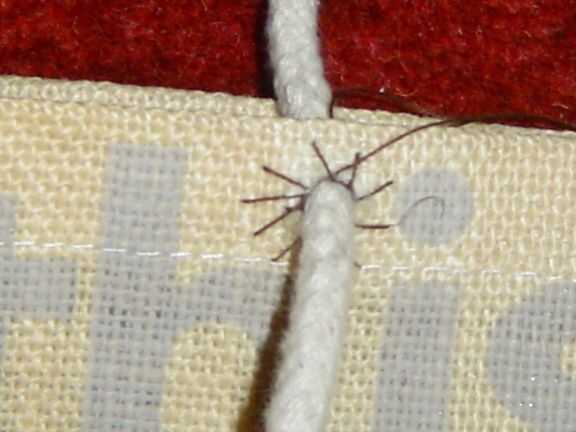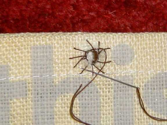 Para poner cada uno habló en, simplemente pase el hilo por el agujero y vuelta a través de la tela circundante.