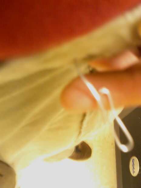 ahora pase el hilo por el agujero hecho con el clip de papel. Iniciado roscar desde el exterior al interior, entonces pasa el alambre a través desde el interior hacia el exterior, pero usted puede hacer lo que quieras