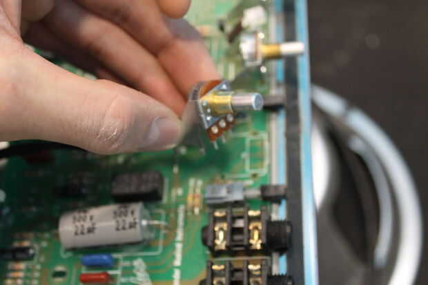 Usando el soldador, calienta las articulaciones donde el pote fue unido a la Junta y aspira la soldadura hacia fuera con la ventosa.