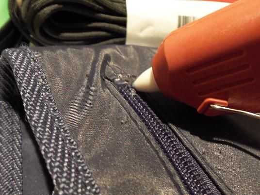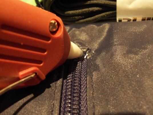 Uso la pistola de pegamento caliente para sellar el agujero de lágrima donde la cremallera llegó deshecha y vuelva a colocar el extremo de la cremallera en el interior de la guarnición de la bolsa.