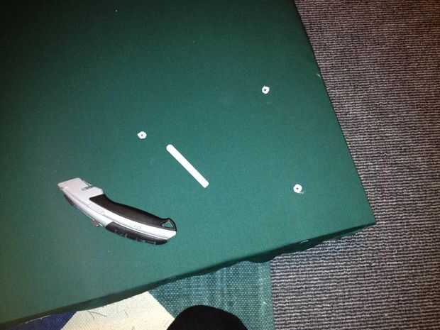 Después de esta cubierta le será necesario exponer los orificios a través del cual caben tus fijaciones de sofá. He copiado la técnica de Ikea. Primero usted tendrá que marcar los orificios. Yo utiliza tiza para marcar la posición de cada agujero. Alrededor de cada agujero de perno con 4 grapas dispuestas en un cuadrado. Estas grapas impedirá que la tela de estiramiento y tarar. Utilice un cuchillo Stanley para cortar alrededor de los orificios para los tornillos marcados pero dentro de las grapas.