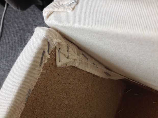 Este paso es importante para evitar que la tela antigua recogida por debajo de la tela nueva. Como se puede ver en imagen 003 se me quitan las grapas del final de la sección de asientos. Mi novia tiró a la tela firmemente mientras que grapas hacia abajo. No tire demasiado apretada aunque porque es fácil comprimir accidentalmente la espuma acolchado irregularmente.