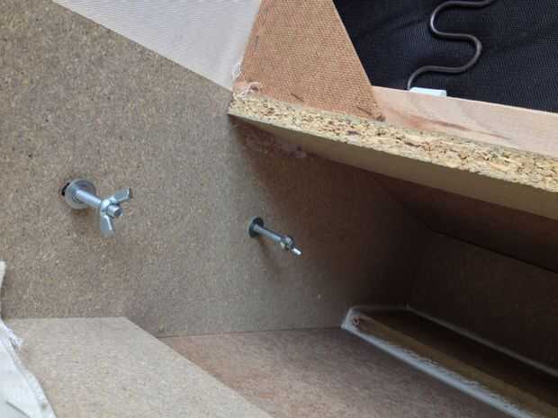 Todo esto se lleva a cabo junto con las tuercas de mariposa y aparte viene en minutos. Retire los pernos de roscados de la pieza del brazo y puso a un lado. Este es un buen momento para realizar cualquier reparación que el sofá podría haber necesitado ya... Grapas sueltas, articulaciones inestables etc..