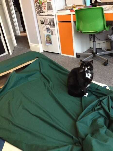 Durante las etapas de corte puede ser útil para pesar los bordes de la tela hacia abajo con un gato de repuesto. Esto detendrá lo sopla lejos. No deje que el gato robar a la tela.