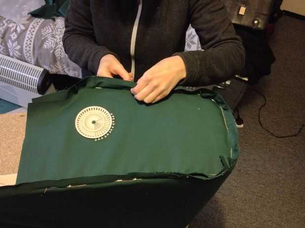 Soporte de la parte posterior de su lado. Fija el panel lateral en el lugar, también pueden ayudar a marcar una línea de costura con tiza o crayón. Hay un labio ligeramente torpe las curvas en la parte superior del asiento del sofá. Puede que tengas a mano coser esta sección en una etapa posterior, aunque logré cuidadosamente la grapa en el lugar.