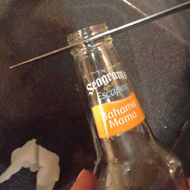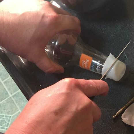 Mantenga el frasco firmemente con una mano. Con la otra mano, utilice un cuchillo afilado y dentado para recortar el exceso de plástico. Asegúrese de quitar la parte inferior de la rosca en el cuello de la botella. Utilizamos la tapa original como una referencia de donde cortar. Esta botella tiene una muesca en ese momento, para no meter el cuchillo.