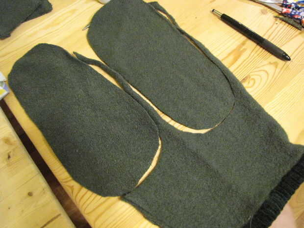 Para obtener el área más plana y utilizable de mi suéter, cortado encima de la costura bajo el brazo de la manga. Me puso la manga hacia fuera plana y cortar dos piezas de la suela de una manga. I ponerlos juntos y decidieron que cada deslizador tendría dos capas de este suéter jaspeado deliciosos como único. Corte dos para cada pie.