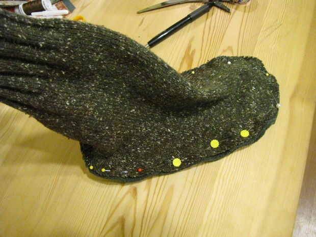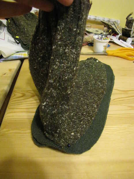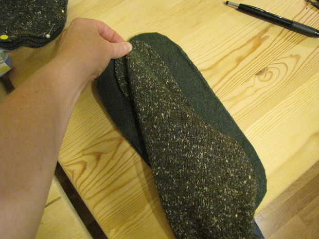 Trabajar su camino en el resto de la zapatilla, estiramiento donde usted necesita. El suéter que usé tenía un poco de elasticidad, ya que no tenía fieltro. Si terminas usando un suéter jaspeado para este paso, puede que necesite trabajar y estirar para persuadir a hacer lo que quiera que!