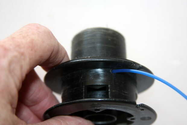 Deja una cola de aproximadamente 4 a 6 pulgadas que te empiezan a recortar. Tengo una pequeña muesca que ponga la línea en que no Baga toda la línea. Lucky me! Meta la línea en la ranura y vuelva a enhebrar en el ojal de su máquina. Cerca de la bobina correctamente en su máquina y dar un suave tirón de la línea de lanzamiento de la muesca. Encendido y blitz lejos!
