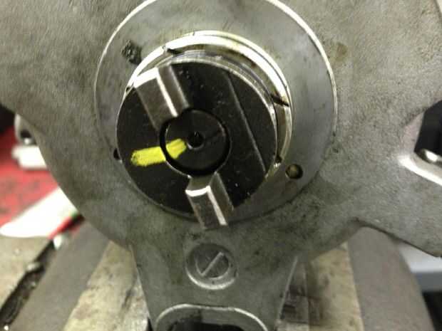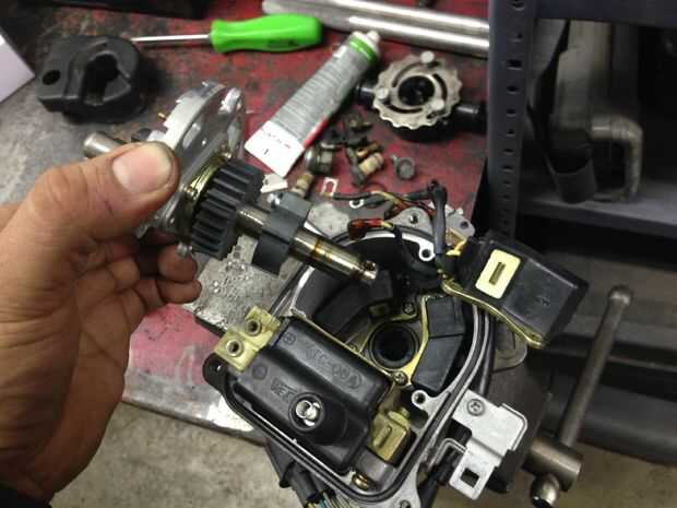 Quite el acoplamiento del distribuidor. Es importante marcar el acoplamiento y el eje para asegurar que va detrás en la misma forma en el montaje. Uso metal selecciona para quitar el retenedor y pasador de diapositivas (Foto 2-4).