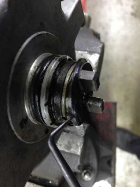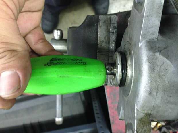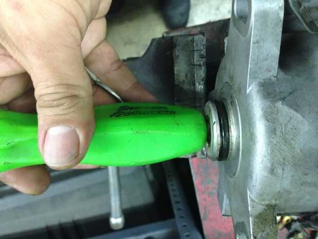 Quitar caja de cojinete y el eje como una sola pieza, debe deslizarse hacia fuera presionando ligeramente sobre ella a mano. Si se siente atascado, puede utilizar el mango del destornillador para golpee suavemente el extremo del eje.