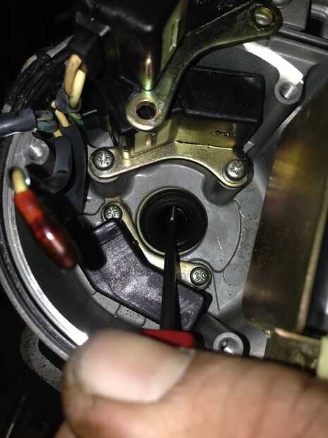 Quitar aceite sello utilizando metal pick, pick insertar bajo y tire hacia arriba para quitarlo, presiona ligeramente el sello de aceite, debe salir con la luz de tira de presión.