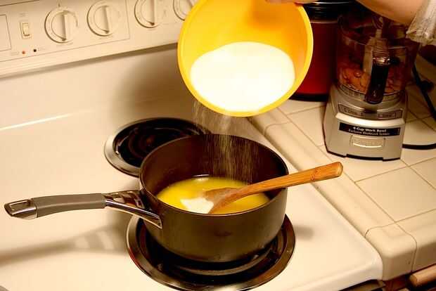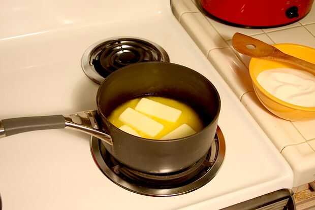 Caliéntalo a fuego medio . Cuando la mantequilla se derrite sobre todo añadir 2 tazas de azúcar blanco y revolver hasta que se combina.