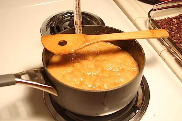 Continuar la cocción, revolviendo ocasionalmente, hasta que un termómetro de caramelo Lee exactamente 315 grados f el. La mezcla dará vuelta caramelo coloreada a medida que se acerca a la temperatura adecuada.