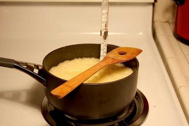 He visto recetas que sugieren cocinar la mezcla de caramelo de 280 grados F hasta 300 grados F. Sin embargo, he hecho este muchas veces dulces y he tenido el producto final no configurado correctamente en los temps... Confía en mí en este caso, cocinar hasta que llegue a 315 grados f el. Asegúrese de prestar mucha atención cuando el termómetro llega a 310 grados y revuelve, para que no quemar tu lote mantecosa de la bondad.