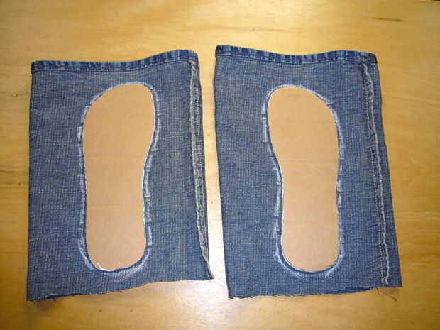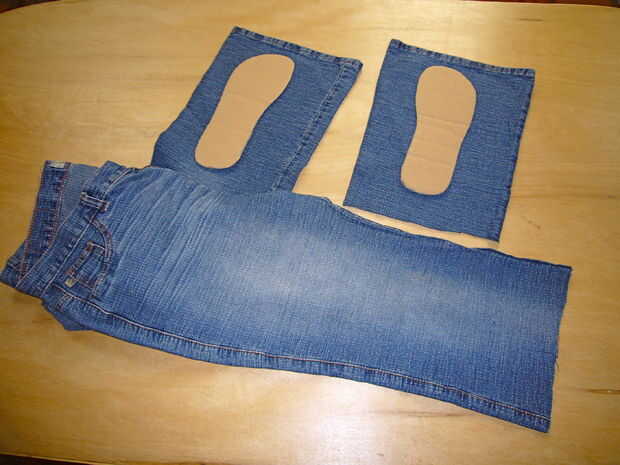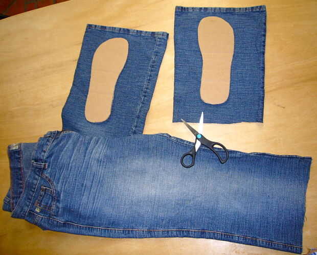 Tomar tus jeans y cortar los extremos de cada pierna del pantalón para que queden unas pocas pulgadas más largo que sus recortes de cartulina.