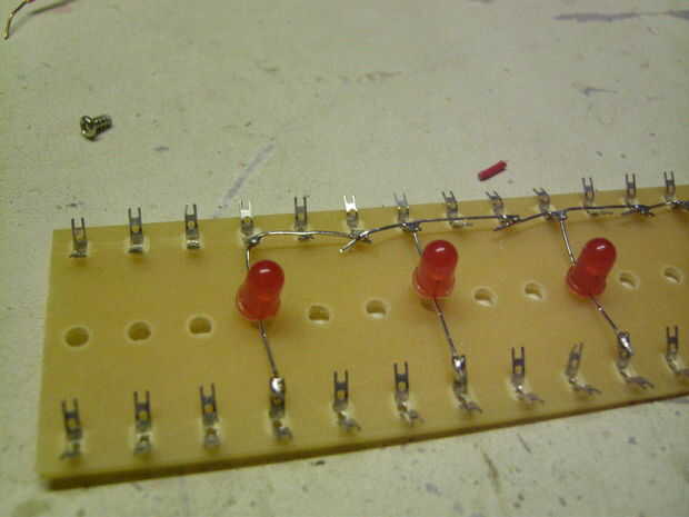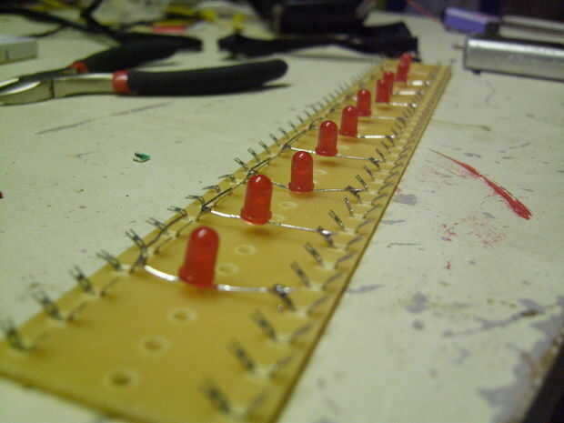 Primero nos soldar los LEDs a la franja de soldadura. Tenga cuidado al soldar todos los LEDs en la misma dirección. Luego conectar los ánodos de los LEDs mediante pequeños trozos de alambre.