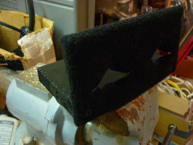 decidí hacer el recinto con sólo dos piezas de madera. Taladrar los agujeros para los metros, pintada la base y atornillada sobre una pieza delgada de madera que cubrí en un material de fieltro grueso. Elegí este diseño porque es fácil de construir y permite un fácil acceso a todos los de la electrónica.