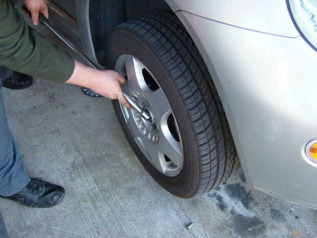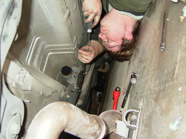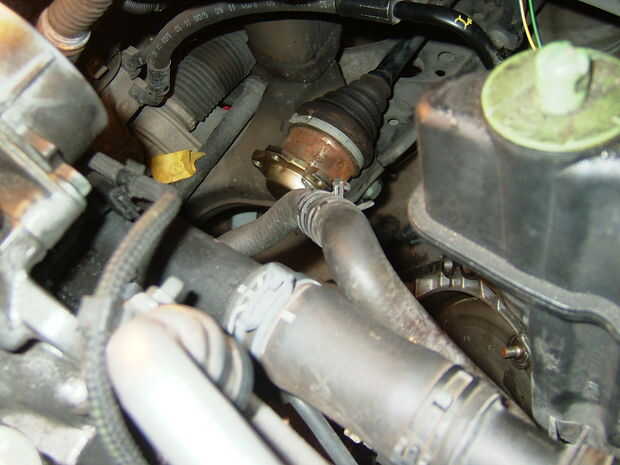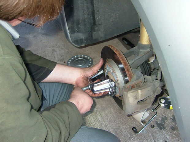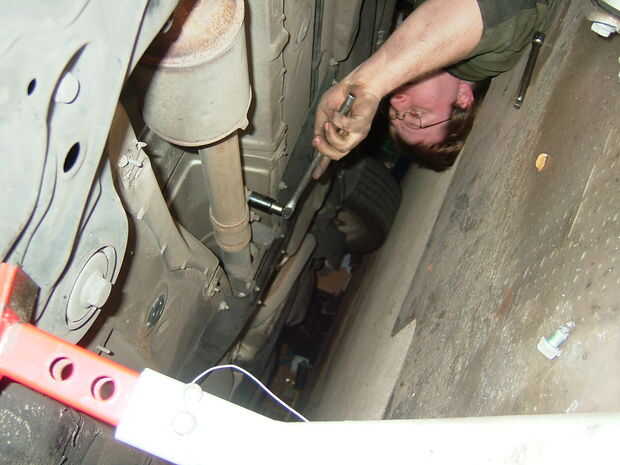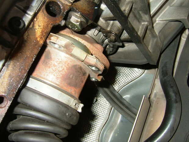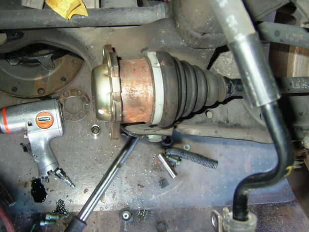 Quitar el volante y las latas de polvo en el motor... un impacto sería agradable aquí, o pídale a alguien que debe el motor en el otro lado... esto debe ser una toma de 12 puntos de 17 o 18 mm.