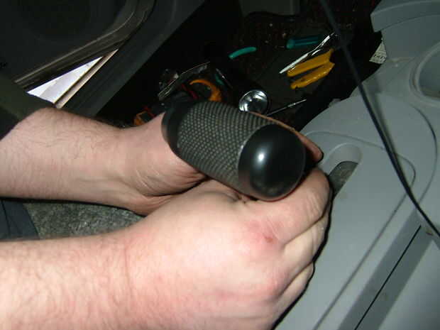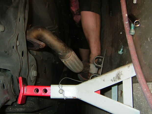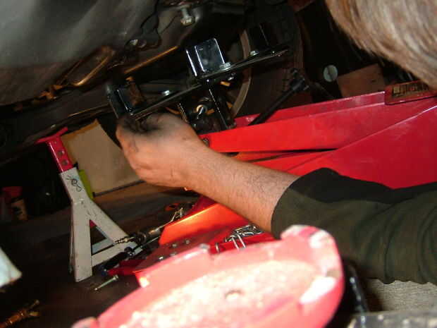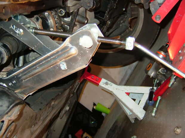 Gire el motor y transmisión ligeramente hacia adelante con un screwjack entre el motor y el bastidor (el coche viene con uno en el tronco... También conocido como "El gato de Widowmaker")