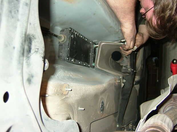Quitar el escudo frontal del calor de la parte inferior del vehículo para exponer el conjunto de la palanca de cambios.