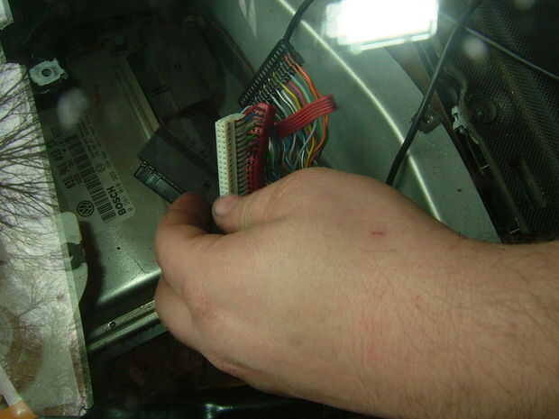 Habrá un cable amarillo y rojo que tiene continuidad con 19 pines en el conector grande de la ECU. Cortar este alambre en el TCU