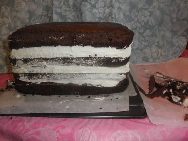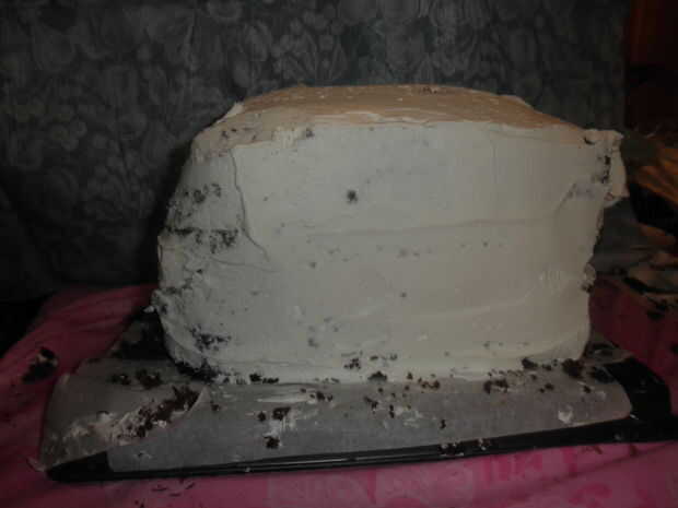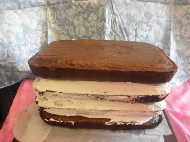 Hice 4 de 13 x 9 pasteles y los apilados para arriba con hielo entre cada capa.  Enfríe el pastel muy bien antes de empezar a tallar su forma. Utilice un cuchillo serrado y solo corte un poco a la vez. Cuando esté satisfecho con su forma de enfriar en la nevera durante unos 10-20 min y luego cubrir con glaseado.