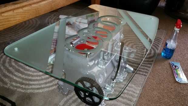 Hola, todo el mundo! He aquí nuestra mesa de centro que ponemos juntos de mi antiguo motor de vw, un pedazo de vidrio de mi vecino de roto soporte de hospitalidad y algunas otras pequeñas cosas (además de las luces). Esta tabla era sobre todo fácil de construir, excepto alineando las líneas para el grabado en la tapa de vidrio. Si te gusta la Ible, pleaseplease y haciendo clic en el emblema del trofeo anterior nos dan un voto! ¡ Muchas gracias!