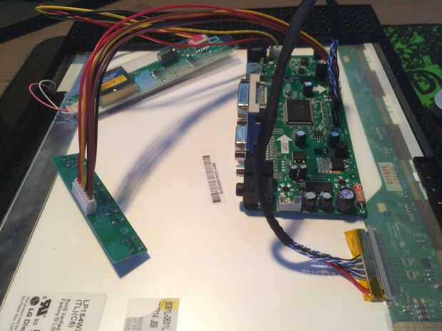 Una vez que el controlador, conecte todo (los cables superior e inferior) y ver si funciona (lo hace en este caso!). Esto es bueno, como que realmente no había probado el panel para ver si funcionaba antes de la mano... Tiene un pixel muerto.
